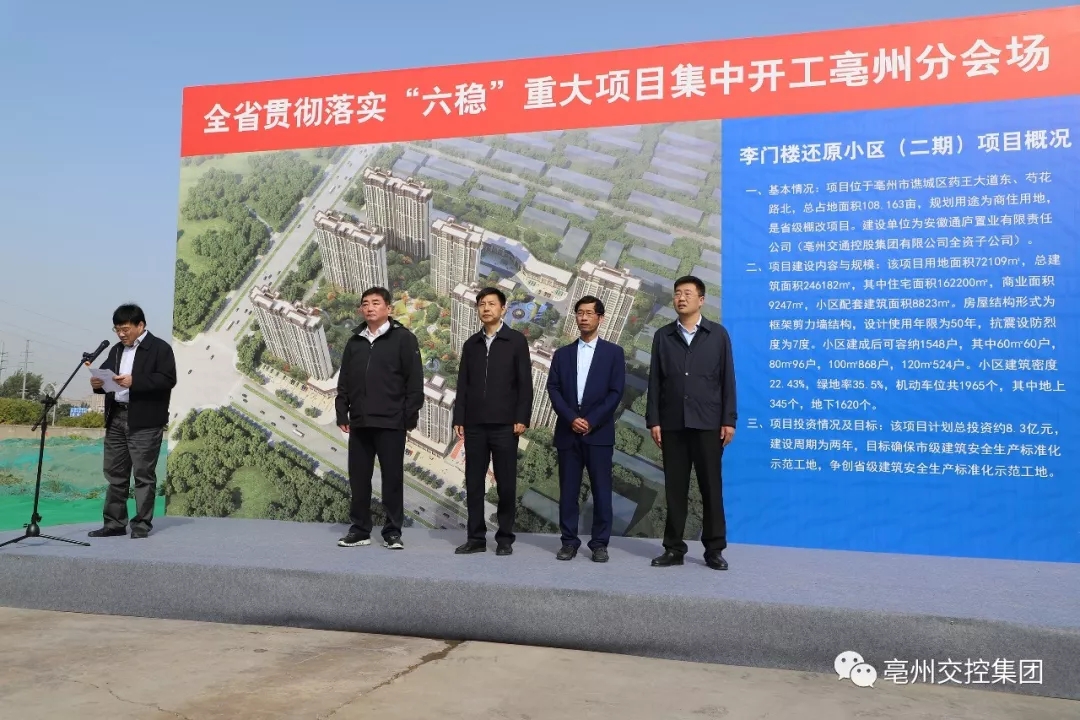 10月28日上午,市貫徹落實“六穩(wěn)”重大項目集中開工儀式在譙城區(qū)李門樓還原小區(qū)項目現(xiàn)場舉行。市委常委、常務(wù)副市長李軍,市政府副秘書長劉巖,市直有關(guān)單位主要負(fù)責(zé)人,各縣區(qū)政府分管負(fù)責(zé)人,集團黨委副書記、總經(jīng)理劉超,財務(wù)總監(jiān)董雷出席開工儀式。