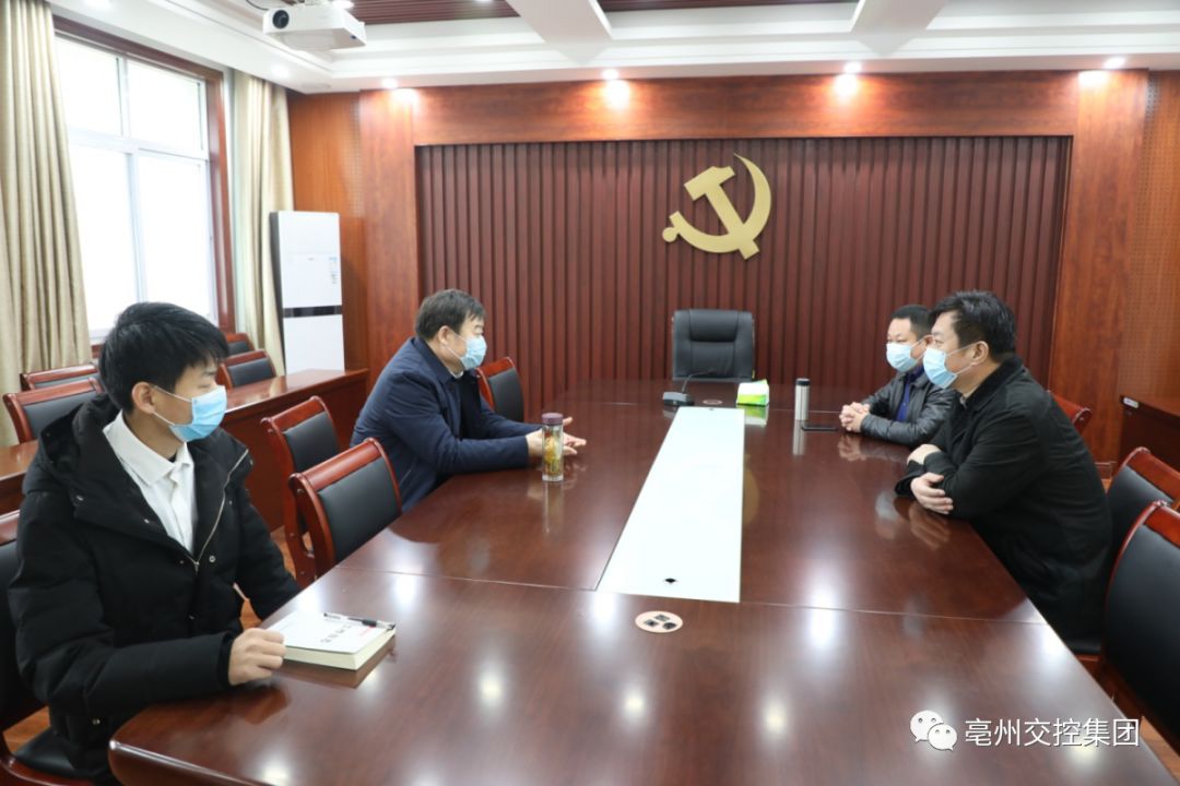 新張集鄉(xiāng)政府會議室里,集團黨委書記、董事長王鍇與正在做疫情防控調(diào)研的利辛縣副縣長吳海波、新張集鄉(xiāng)黨委書記閆曉丹親切交談。