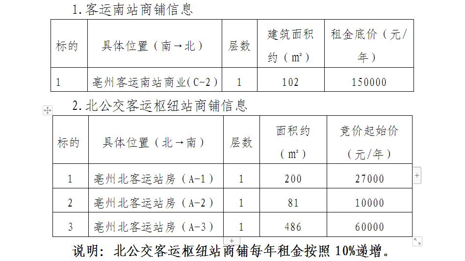 (一)項目概況與實施范圍:安徽通享交通科技有限公司擬對亳州客運南站及北公交客運樞紐站商鋪進行招租,位置、面積、競價起始價等具體情況如下表所示: