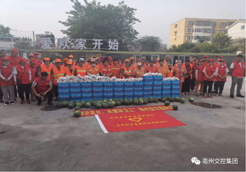 2020年5月26日下午5時(shí),為了感謝城市美容師的辛勤付出,譙城區(qū)青年志愿者協(xié)會(huì)聯(lián)合青年創(chuàng)業(yè)善食館為亳州上善環(huán)保公司30名環(huán)衛(wèi)工人代表送來(lái)了蘇打水、西瓜、毛巾、肥皂、風(fēng)油精等防暑用品,讓他們?cè)谘谉嶂懈惺艿揭唤z清涼。