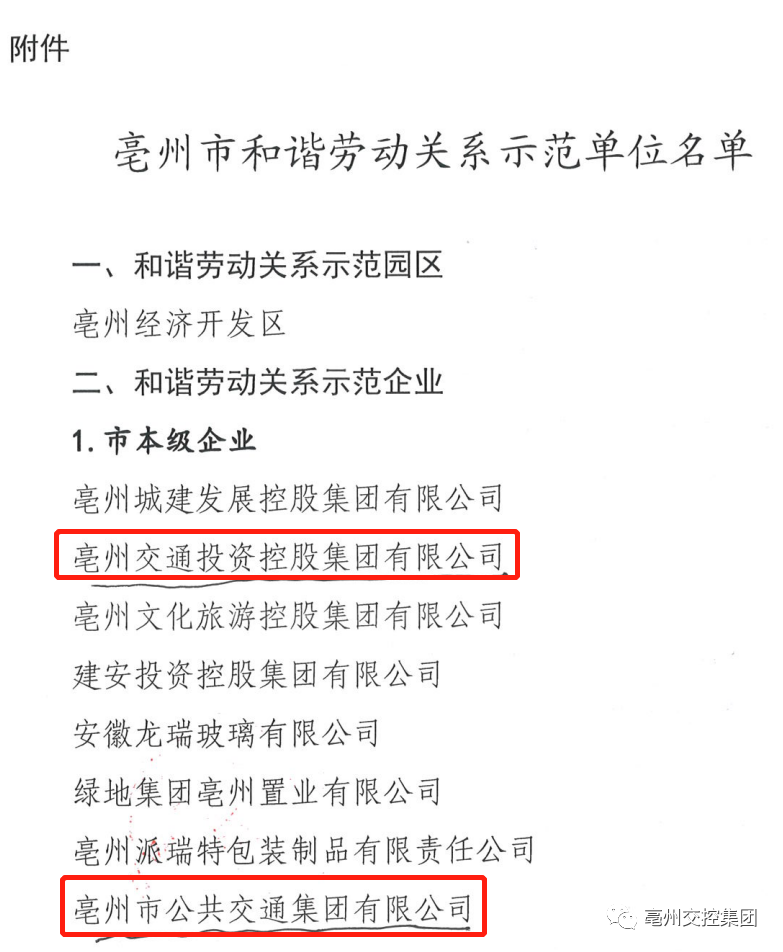 近日,由亳州市人力資源和社會保障局、亳州市總工會、亳州市企業(yè)(企業(yè)家)聯(lián)合會及亳州市工商業(yè)聯(lián)合會開展的亳州市和諧勞動關系示范單位評價確認工作落下帷幕,交控集團被確認為“亳州市和諧勞動關系示范企業(yè)”。