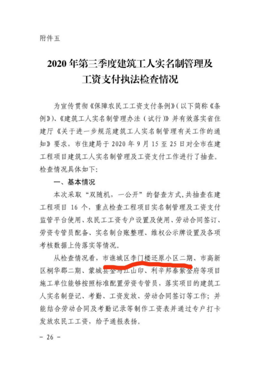 近日,安徽通廬置業(yè)有限責(zé)任公司開(kāi)發(fā)建設(shè)的李門樓還原小區(qū)(二期)建設(shè)項(xiàng)目建筑工人實(shí)名制及工資支付管理工作措施落實(shí)到位,榮獲亳州市住建局通報(bào)表?yè)P(yáng)。