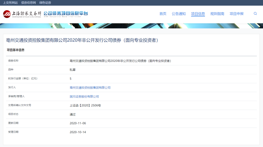 11月6日,根據(jù)上海證券交易所公司債券項目信息平臺公示,亳州交控集團(tuán)2020年非公開發(fā)行公司債券項目狀態(tài)更新為“通過”,交易所確認(rèn)文件文號為“上證函【2020】2506號”。