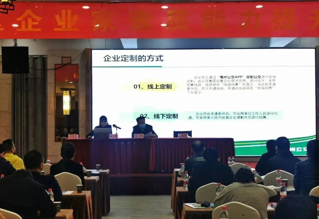 為推進定制公交業(yè)務的開展,公交集團定制公交推廣小組多次來到譙城經開區(qū)管委會進行宣傳,得到了園區(qū)領導的大力支持。近日,在譙城區(qū)企業(yè)家素質能力提升培訓會上,推廣小組向企業(yè)家們宣傳推廣定制公交業(yè)務。在現(xiàn)場,推廣小組成員向大家介紹了定制公交優(yōu)勢、開通條件、開通方式等內容,并一一解答了大家的疑惑。