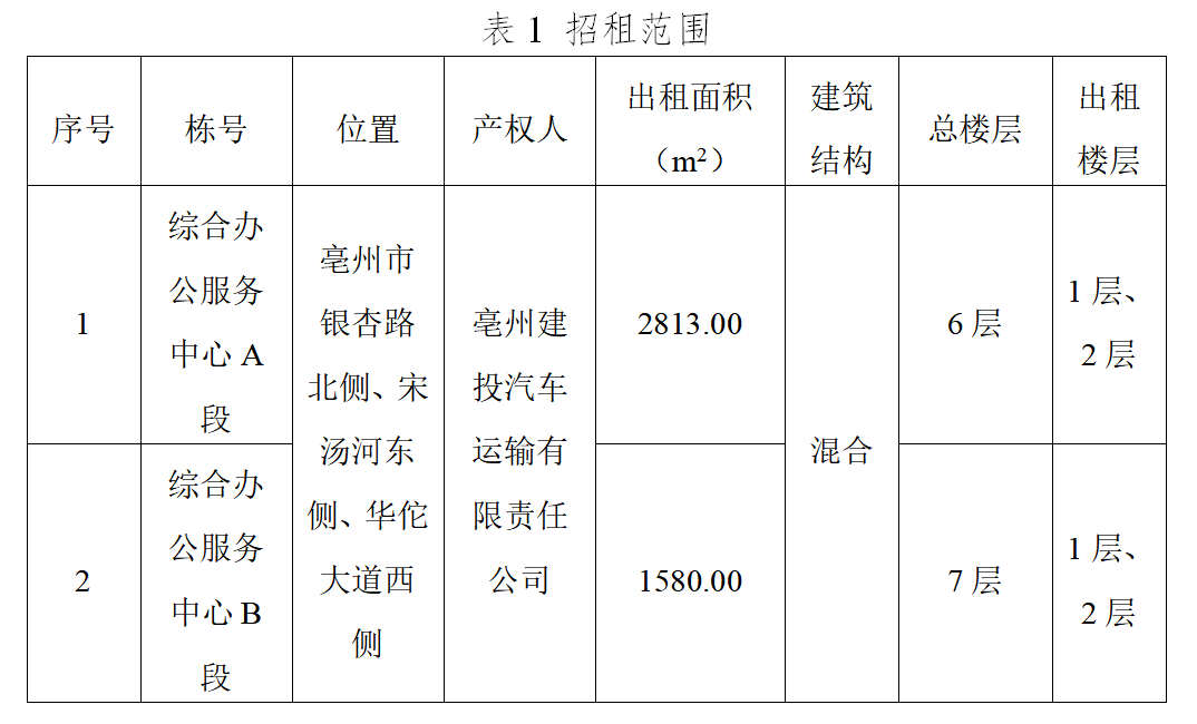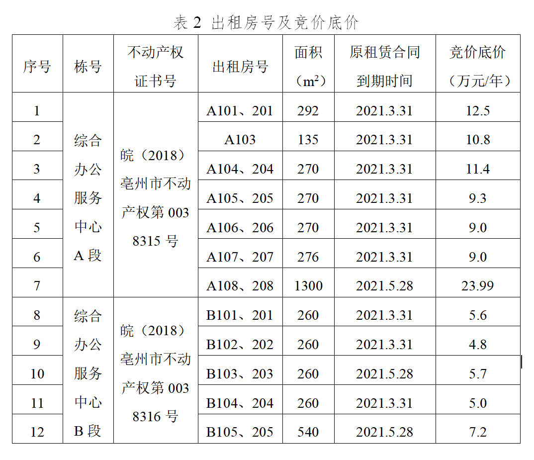 (二)招租范圍:本項(xiàng)目招租范圍及競價(jià)底價(jià)詳見下表: