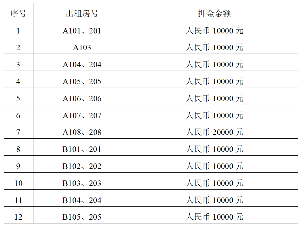 (五)競價(jià)保證金的退還(本金無息):(1)招租不成功的,15日內(nèi)直接退還至該競價(jià)人匯出賬戶。(2)承租候選人公示期滿且確定承租人后,未成交的承租候選人的競價(jià)保證金在10日內(nèi)直接退還至該競價(jià)人匯出賬戶。(3)成交承租人的競價(jià)保證金自動轉(zhuǎn)為押金,押金金額詳見下表,不足部分由成交承租人在簽訂合同時(shí)補(bǔ)交,合同到期且無違約行為發(fā)生或違約行為已處理的情況下,無息退還全部押金。