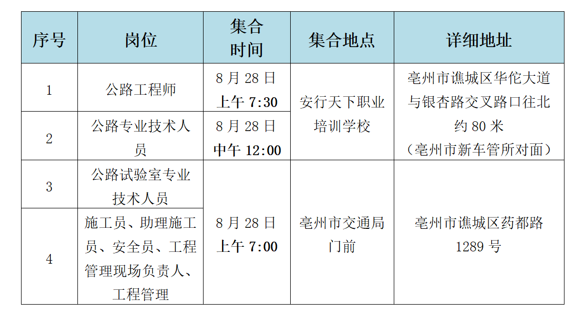 亳州市交通資產(chǎn)管理有限責(zé)任公司2021年工程專業(yè)技術(shù)人員實(shí)操測(cè)試時(shí)間定于2021年8月28日(本周六)上午7:00開(kāi)始,具體安排如下: