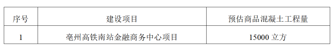 (一)項(xiàng)目概況:為保障亳州高鐵南站金融商務(wù)中心項(xiàng)目正常施工,招標(biāo)人擬對(duì)上述建設(shè)項(xiàng)目需求商品混凝土進(jìn)行采購(gòu)。亳州高鐵南站金融商務(wù)中心項(xiàng)目位于亳州市高新區(qū)酒城大道與神農(nóng)大道交叉口,計(jì)劃工期540日歷天。