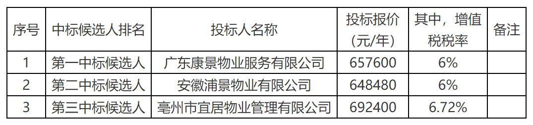 招標(biāo)人確定廣東康景物業(yè)服務(wù)有限公司為中標(biāo)人,中標(biāo)價(jià)657600元每年,服務(wù)期限自合同簽訂之日起3年,質(zhì)量標(biāo)準(zhǔn)符合國家、地方、行業(yè)現(xiàn)行相關(guān)規(guī)范合格標(biāo)準(zhǔn),符合招標(biāo)文件第五章發(fā)包人要求。