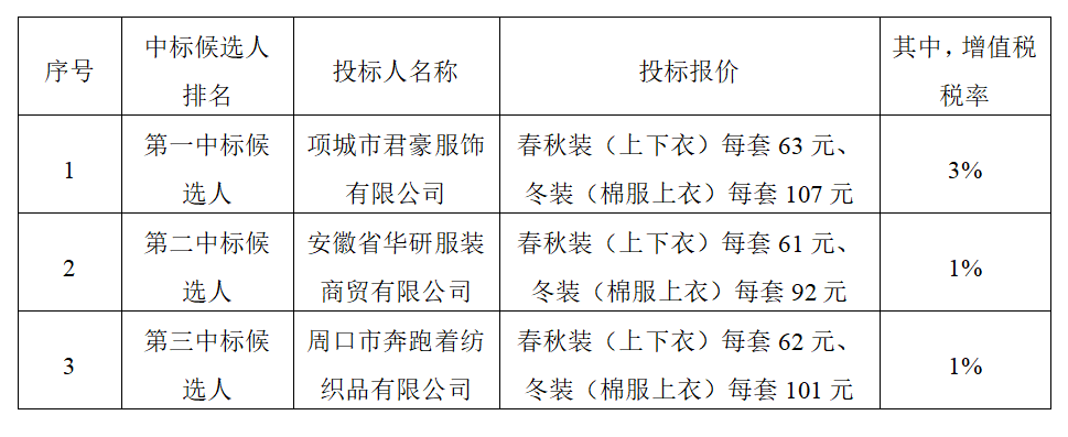 根據(jù)有關(guān)規(guī)定,招標人確定項城市君豪服飾有限公司為中標人,中標價為春秋裝(上下衣)每套63元、冬裝(棉服上衣)每套107元,交貨期:自接到招標人供貨通知后10日歷天內(nèi)提供2000套春秋裝、自接到招標人供貨通知后60日歷天內(nèi)提供剩余2000套春秋裝、自接到招標人供貨通知后30日歷天內(nèi)完成冬裝供貨,交貨地點:亳州市內(nèi),招標人指定地點,完成本項目投標產(chǎn)品的供貨、運輸、裝卸、調(diào)換、售后服務(wù)等工作。