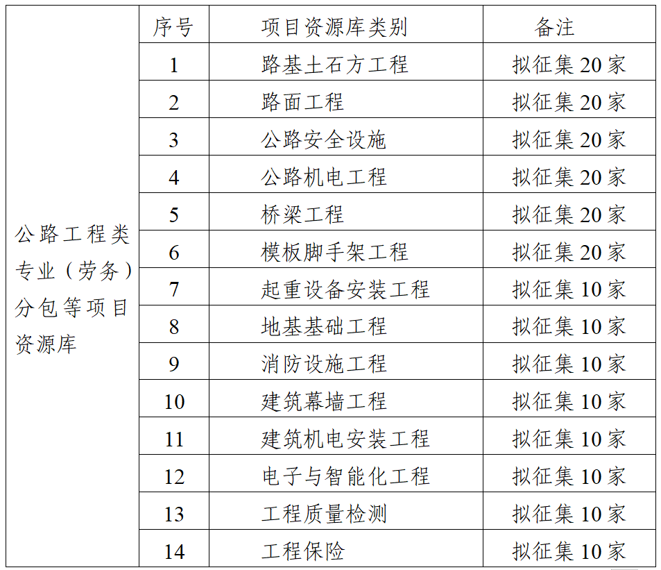 本采購(gòu)項(xiàng)目安徽通康建設(shè)工程有限公司公路工程類專業(yè)(勞務(wù))分包等項(xiàng)目資源庫(kù)(項(xiàng)目編號(hào):BZJK-2022-019號(hào)),采購(gòu)人為安徽通康建設(shè)工程有限公司,該項(xiàng)目已具備采購(gòu)條件,現(xiàn)對(duì)項(xiàng)目資源庫(kù)進(jìn)行公開征集。