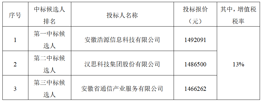根據有關規(guī)定,招標人確定安徽浩源信息科技有限公司為中標人,中標價(大寫)壹佰肆拾玖萬貳仟零玖拾壹元,(小寫)1492091元(其中,增值稅稅率為13%),完成本項目投標設備的供貨、運輸、裝卸、技術支持與培訓、售后服務等工作,并按合同約定履行義務。