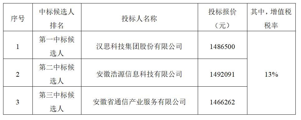 根據(jù)有關規(guī)定,招標人確定漢思科技集團股份有限公司為中標人,中標價(大寫)壹佰肆拾捌萬陸仟伍佰元,(小寫)1486500元(其中,增值稅稅率為13%),完成本項目投標設備的供貨、運輸、裝卸、技術支持與培訓、售后服務等工作,并按合同約定履行義務。