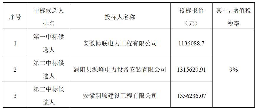 根據(jù)有關(guān)規(guī)定,招標(biāo)人確定安徽博聯(lián)電力工程有限公司為中標(biāo)人,中標(biāo)價(jià)為人民幣(大寫)壹佰壹拾叁萬陸仟零捌拾捌元柒角,(小寫)1136088.7元,工期30日歷天,按合同約定實(shí)施和完成承包工程,修補(bǔ)工程中的任何缺陷,工程質(zhì)量符合國家、地方、行業(yè)現(xiàn)行相關(guān)規(guī)范合格標(biāo)準(zhǔn),符合設(shè)計(jì)圖紙、圖集規(guī)定標(biāo)準(zhǔn),通過供電主管部門驗(yàn)收,滿足招標(biāo)文件第五章技術(shù)標(biāo)準(zhǔn)和要求。
