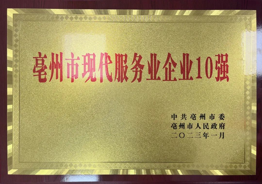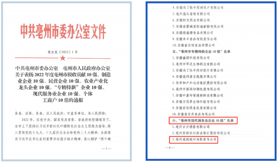 在“亳州市現(xiàn)代服務業(yè)企業(yè)10強”名單中,通潤建材公司名列第三,這是集團下屬子公司首次獲得此殊榮。