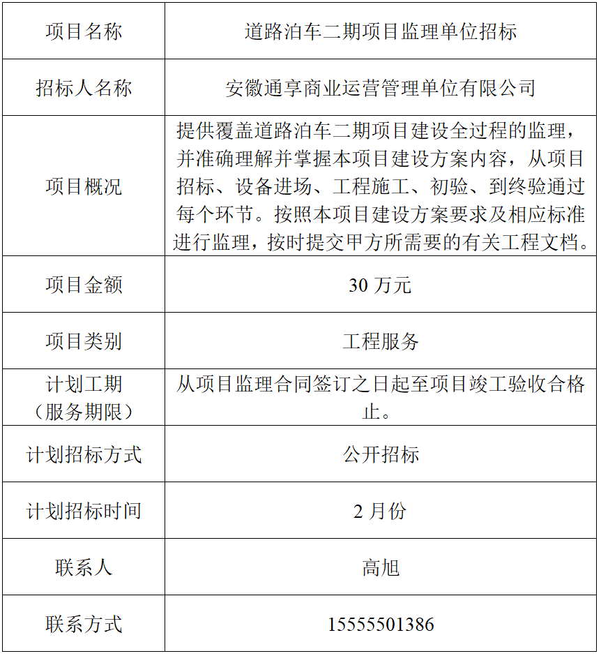 為便于潛在投標人及時了解招標信息,現(xiàn)將安徽通享商業(yè)運營管理單位有限公司(招標人名稱)的招標計劃發(fā)布如下: