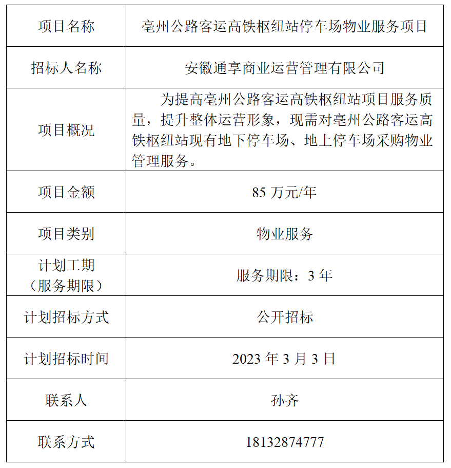 為便于潛在投標(biāo)人及時(shí)了解招標(biāo)信息,現(xiàn)將安徽通享商業(yè)運(yùn)營(yíng)管理有限公司的招標(biāo)計(jì)劃發(fā)布如下: