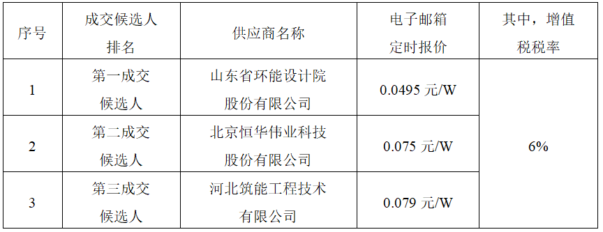 根據(jù)詢價(jià)公告規(guī)定,采購人確定山東省環(huán)能設(shè)計(jì)院股份有限公司為成交人,成交價(jià)0.0495元/W,最終合同總價(jià)以實(shí)際裝機(jī)容量為準(zhǔn),按照合同約定完成全部咨詢、勘察、設(shè)計(jì)工作。