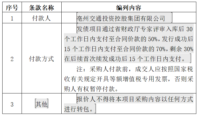 (二)采購范圍:提供符合安徽省財政廳要求的項目實施方案,包括項目資金平衡方案。包括但不限于項目基本情況、經(jīng)濟社會效益分析、項目投資估算及資金籌措、項目預期收益、成本及融資平衡情況、項目融資計劃、潛在影響項目收益和融資平衡結(jié)果的各種風險評估、信息披露計劃等。同時,提供會計師事務所出具的項目財務評估報告、律師事務所出具的項目法律意見書,出具單位應具備相應的執(zhí)業(yè)資格和債券發(fā)行咨詢資質(zhì)。