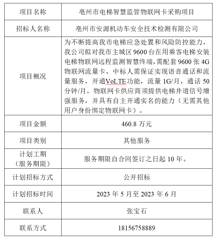 為便于潛在投標(biāo)人及時了解招標(biāo)信息,現(xiàn)將亳州市安源機(jī)動車安全技術(shù)檢測有限公司(招標(biāo)人名稱)的招標(biāo)計劃發(fā)布如下: