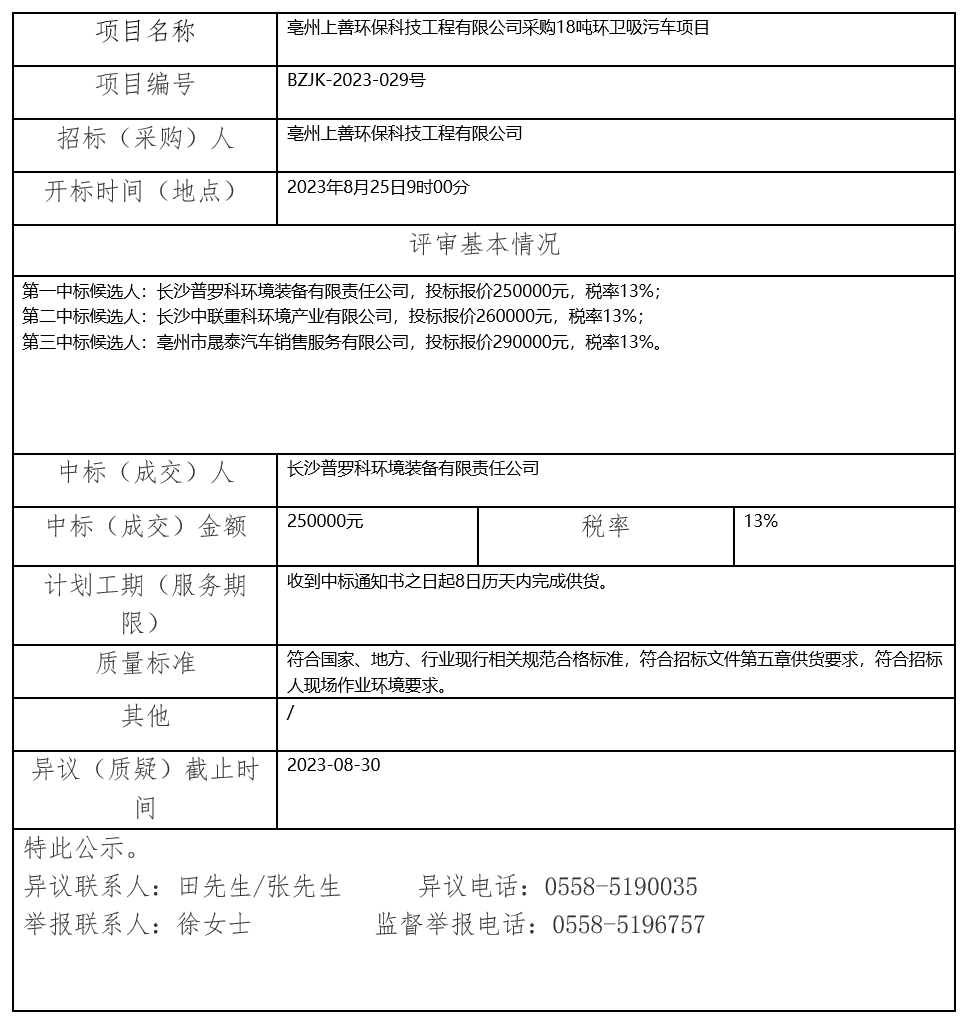 亳州上善環(huán)??萍脊こ逃邢薰静少?8噸環(huán)衛(wèi)吸污車項(xiàng)目中標(biāo)結(jié)果公示