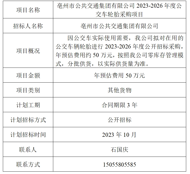 為便于潛在投標人及時了解招標信息,現(xiàn)將亳州市公共交通集團有限公司(招標人名稱)的招標計劃發(fā)布如下: