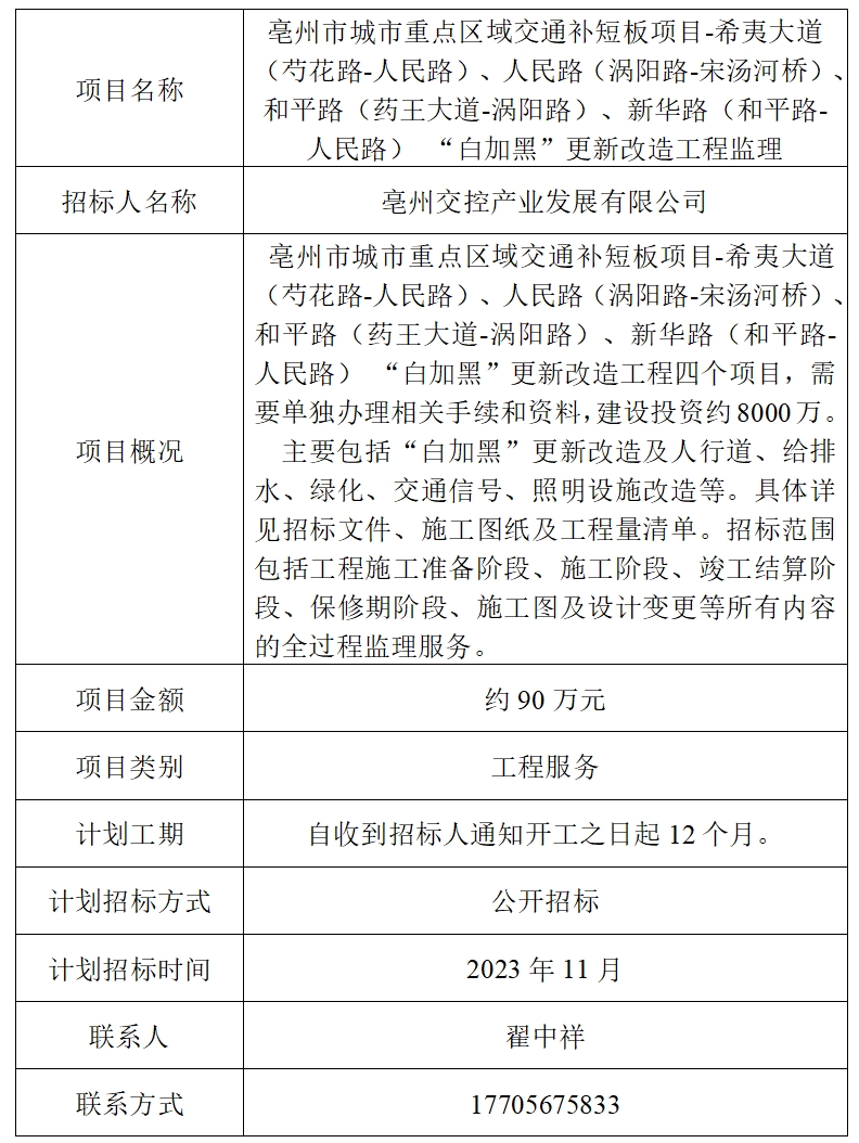 為便于潛在投標(biāo)人及時(shí)了解招標(biāo)信息,現(xiàn)將亳州交控產(chǎn)業(yè)發(fā)展有限公司(招標(biāo)人名稱)的招標(biāo)計(jì)劃發(fā)布如下: