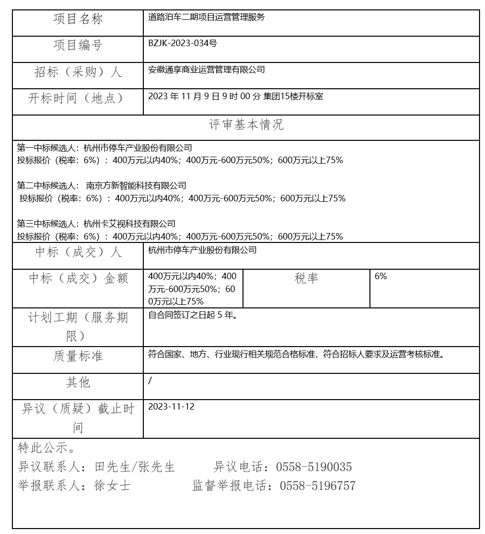 道路泊車(chē)二期項(xiàng)目運(yùn)營(yíng)管理服務(wù)中標(biāo)(成交)結(jié)果公示