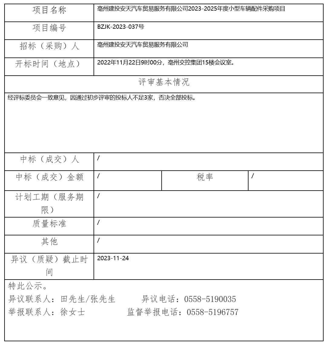 亳州建投安天汽車貿(mào)易服務(wù)有限公司2023-2025年度小型車輛配件采購項(xiàng)目中標(biāo)(成交)結(jié)果公示