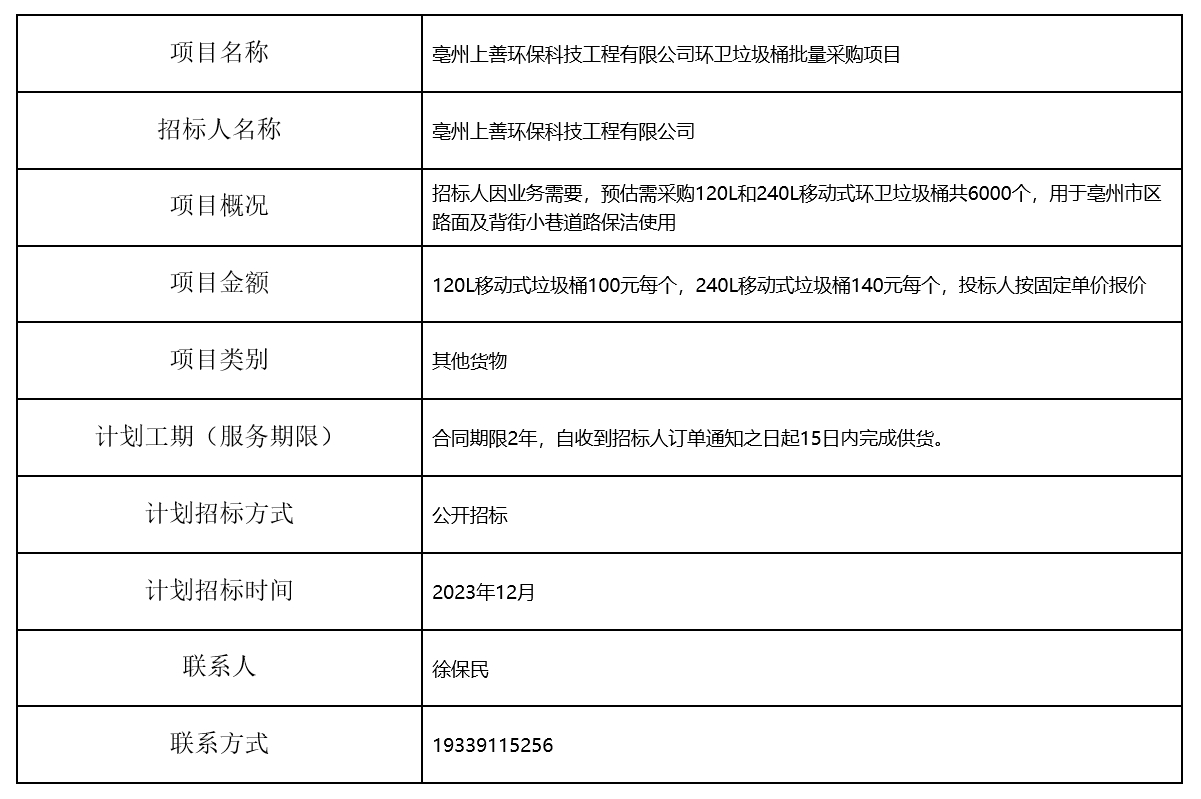亳州上善環(huán)??萍脊こ逃邢薰经h(huán)衛(wèi)垃圾桶批量采購(gòu)項(xiàng)目招標(biāo)計(jì)劃