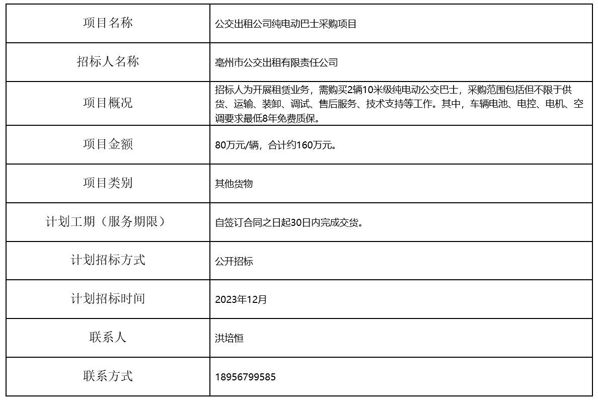 公交出租公司純電動(dòng)巴士采購(gòu)項(xiàng)目招標(biāo)計(jì)劃