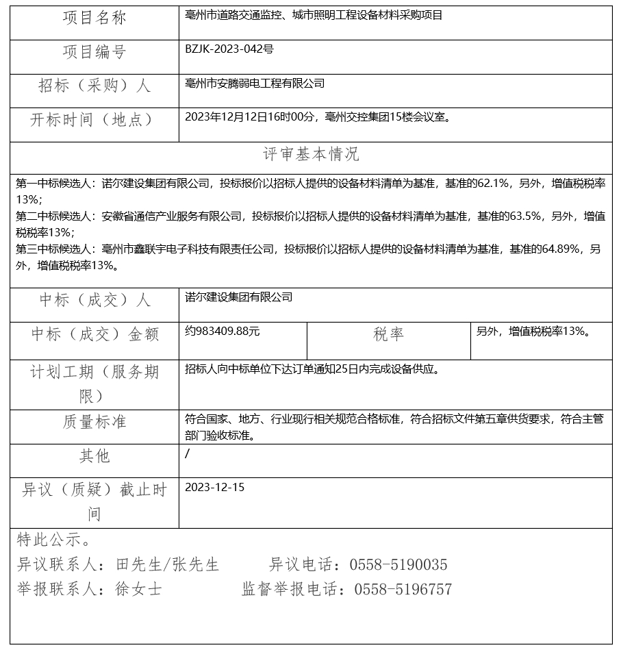 亳州市道路交通監(jiān)控、城市照明工程設(shè)備材料采購項目中標(成交)結(jié)果公示