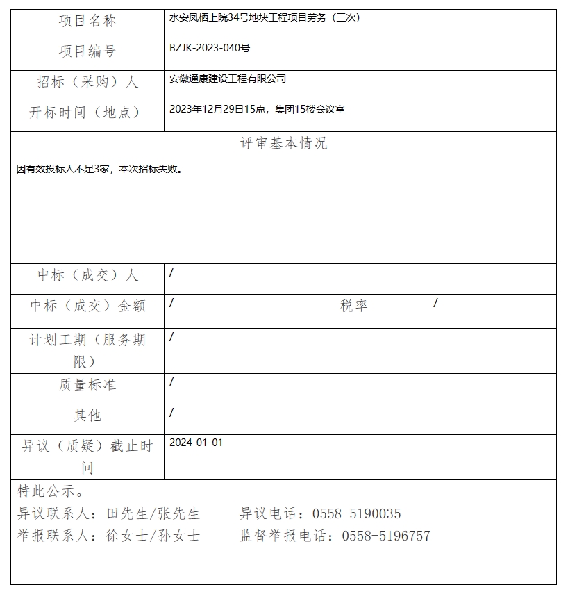 水安鳳棲上院34號(hào)地塊工程項(xiàng)目勞務(wù)(三次)中標(biāo)(成交)結(jié)果公示