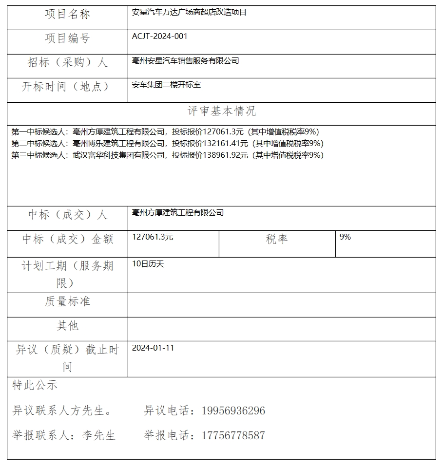 安星汽車萬達(dá)廣場商超店改造項目中標(biāo)(成交)結(jié)果公示