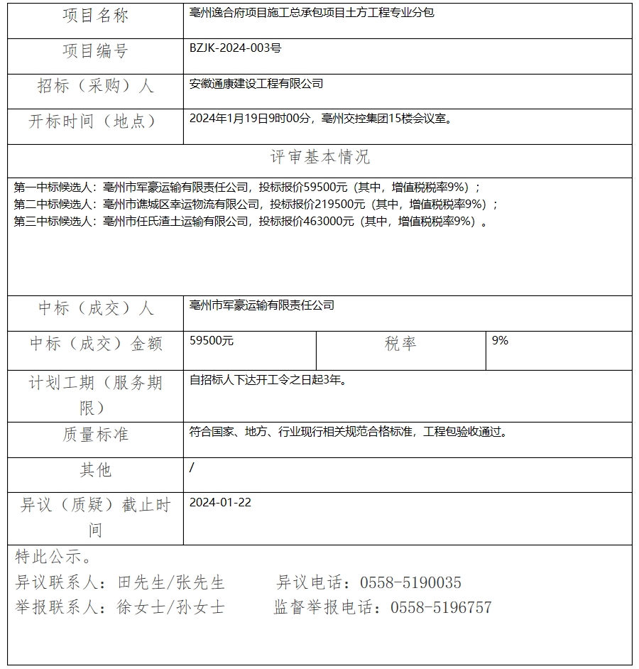 亳州逸合府項(xiàng)目施工總承包項(xiàng)目土方工程專業(yè)分包中標(biāo)(成交)結(jié)果公示