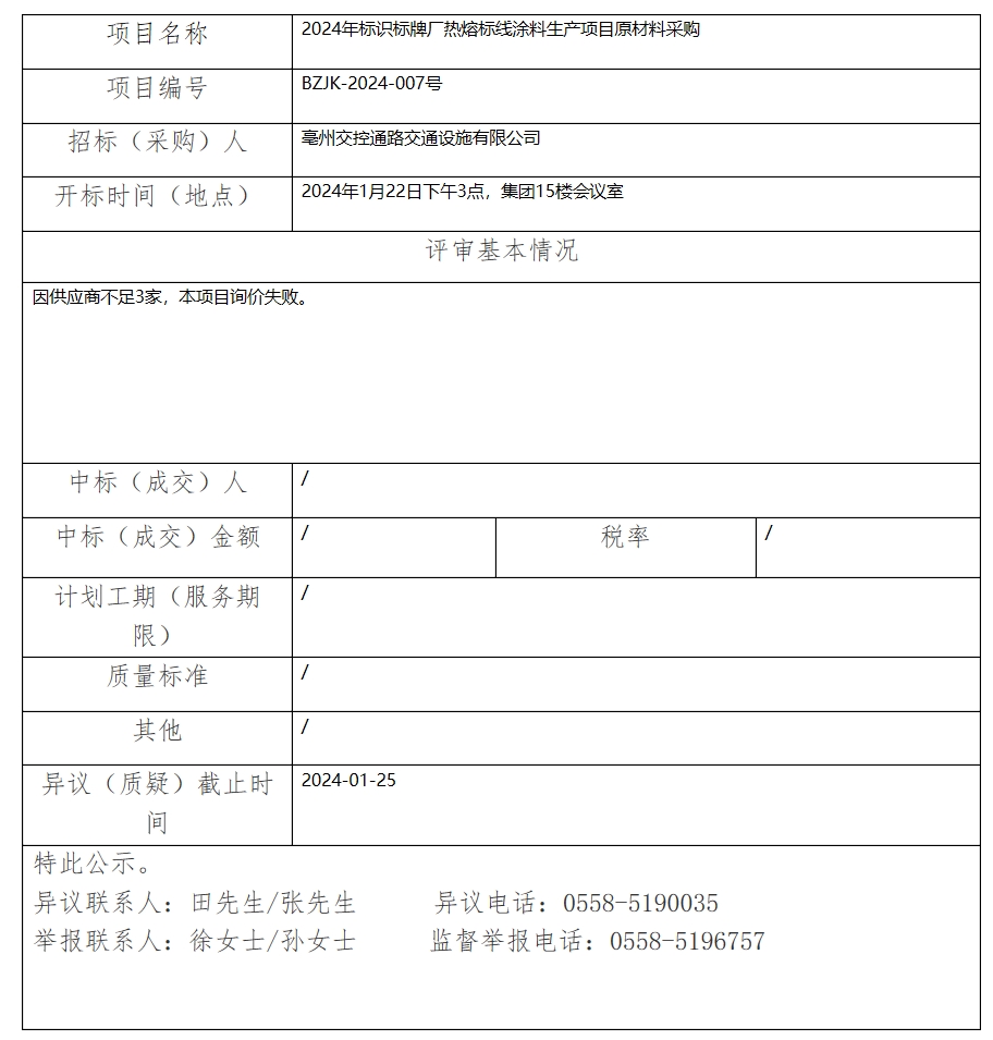 2024年標(biāo)識(shí)標(biāo)牌廠熱熔標(biāo)線涂料生產(chǎn)項(xiàng)目原材料采購(gòu)中標(biāo)(成交)結(jié)果公示