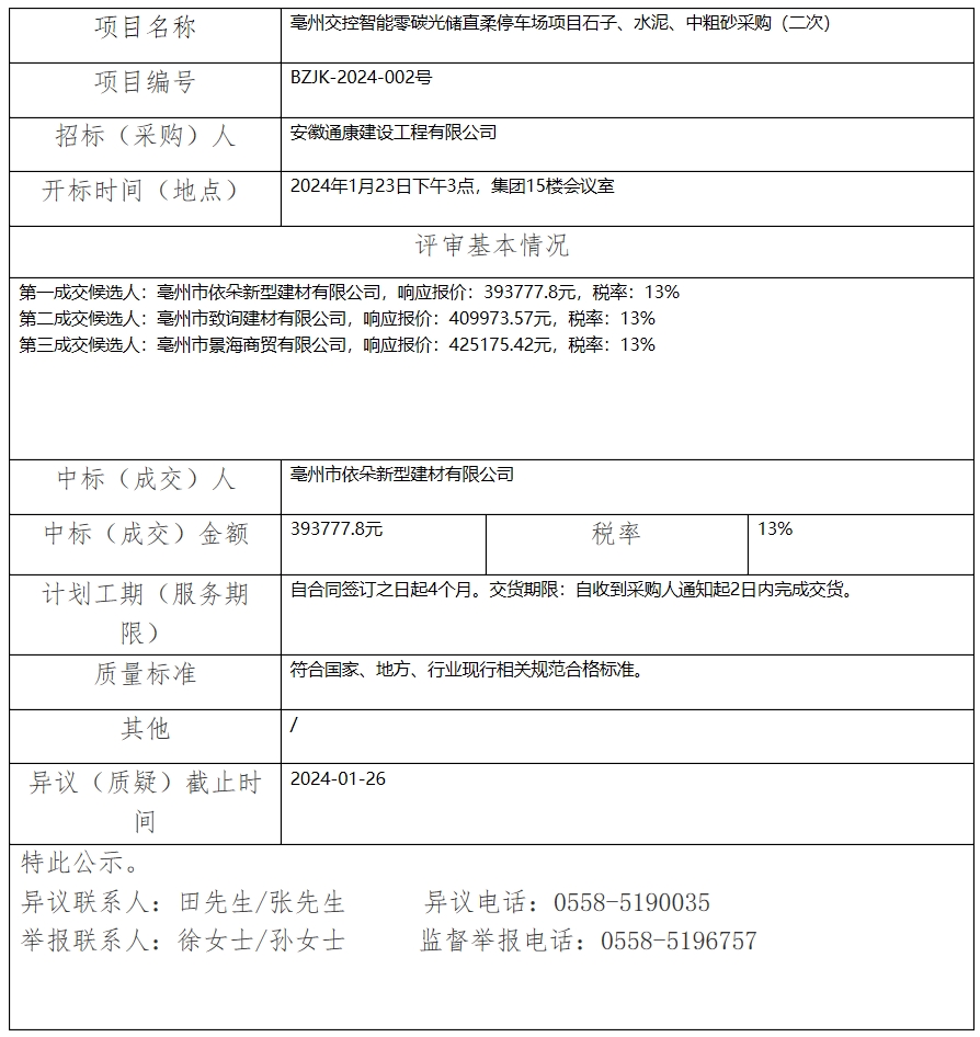亳州交控智能零碳光儲(chǔ)直柔停車場(chǎng)項(xiàng)目石子、水泥、中粗砂采購(gòu)(二次) 中標(biāo)(成交)結(jié)果公示