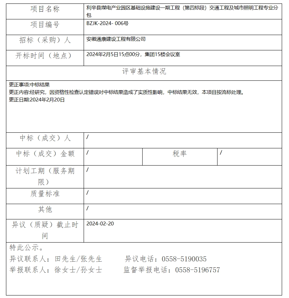利辛縣煤電產(chǎn)業(yè)園區(qū)基礎(chǔ)設(shè)施建設(shè)一期工程(第四標(biāo)段)交通工程及城市照明工程專業(yè)分包中標(biāo)結(jié)果更正公示