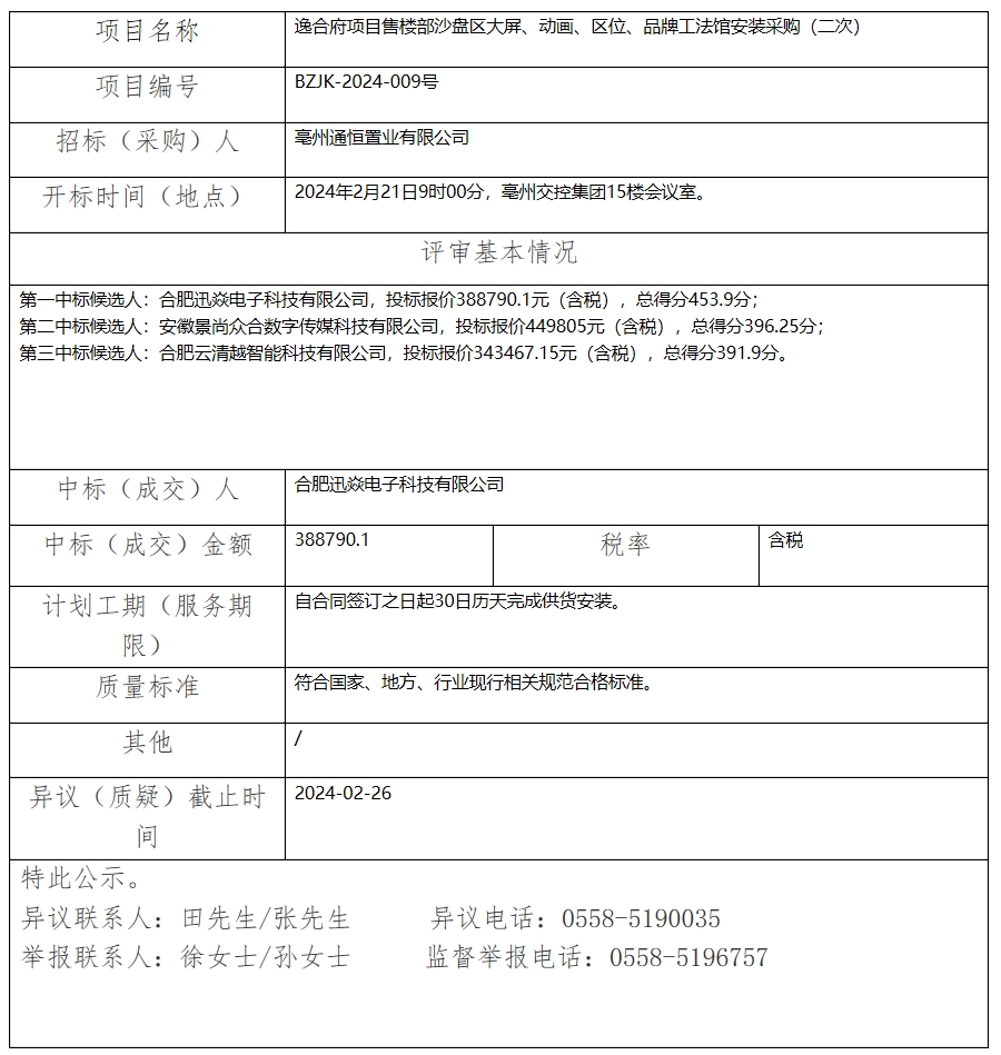 逸合府項(xiàng)目售樓部沙盤區(qū)大屏、動(dòng)畫、區(qū)位、品牌工法館安裝采購(二次)中標(biāo)(成交)結(jié)果公示