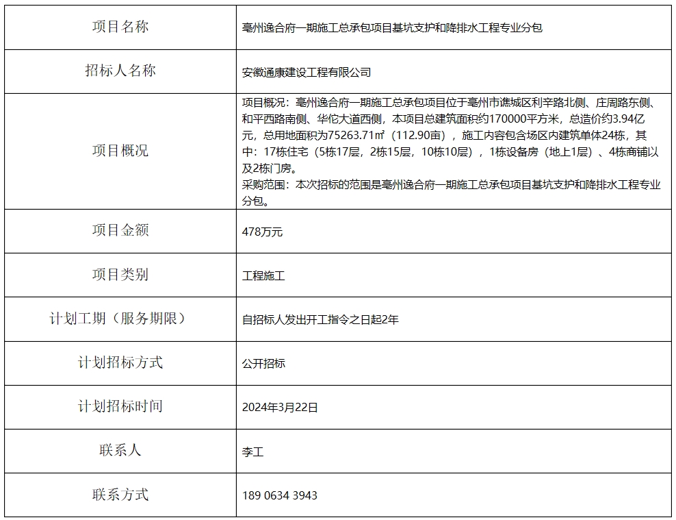 亳州逸合府一期施工總承包項目基坑支護(hù)和降排水工程專業(yè)分包招標(biāo)計劃