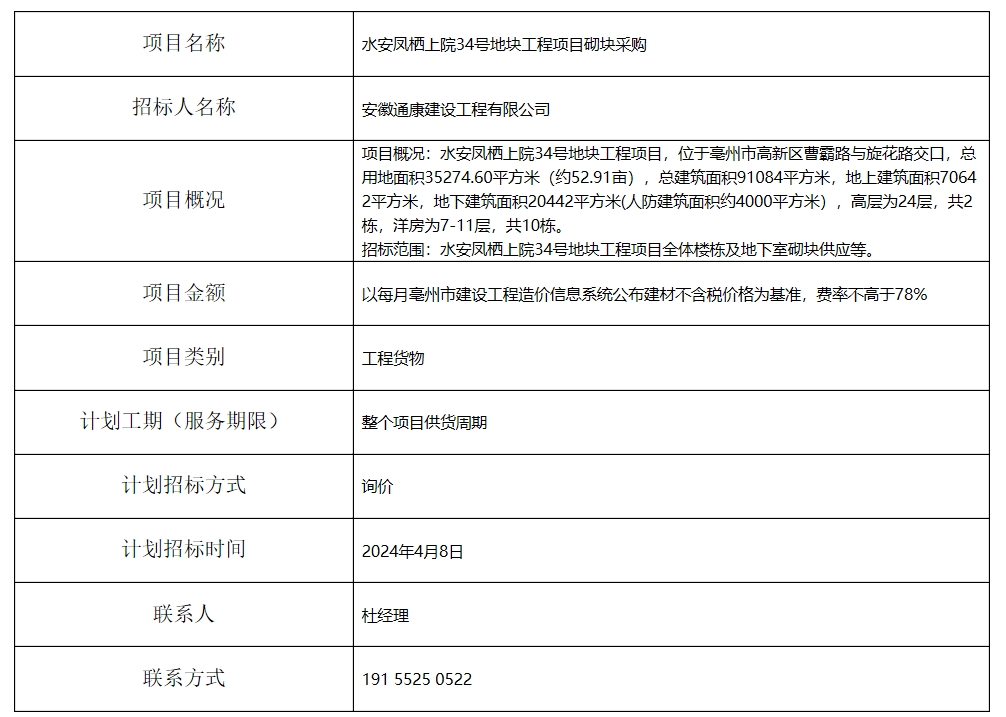 水安鳳棲上院34號(hào)地塊工程項(xiàng)目砌塊采購(gòu)招標(biāo)計(jì)劃