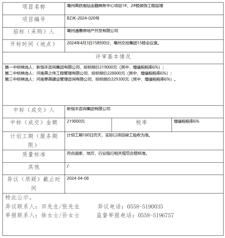 亳州高鐵南站金融商務(wù)中心項(xiàng)目1#、2#樓裝飾工程監(jiān)理中標(biāo)(成交)結(jié)果公示
