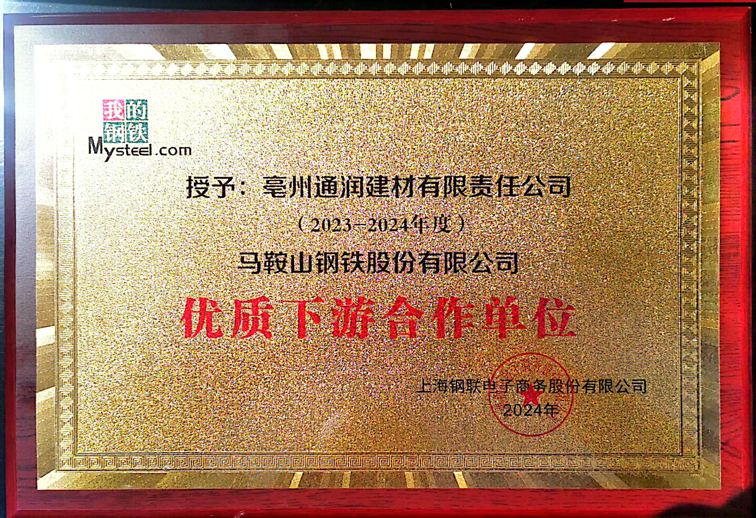 3月28日,在2024鋼鐵中國·第四屆安徽黑色金屬產(chǎn)業(yè)鏈供需交流研討大會上,亳州通潤建材有限責(zé)任公司獲得“2023-2024年度馬鞍山鋼鐵股份有限公司優(yōu)質(zhì)下游合作單位”,公司連續(xù)2年獲得此項榮譽。