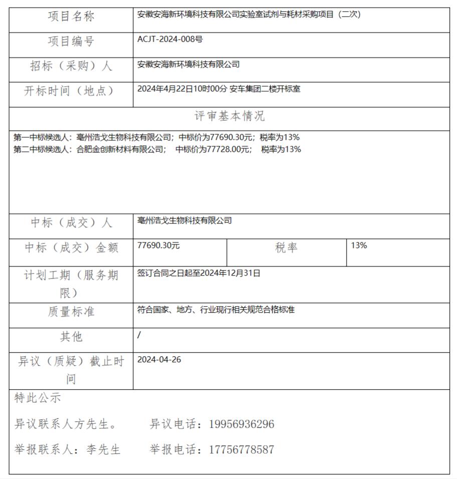安徽安海新環(huán)境科技有限公司實(shí)驗(yàn)室試劑與耗材采購(gòu)項(xiàng)目(二次)中標(biāo)(成交)結(jié)果公示
