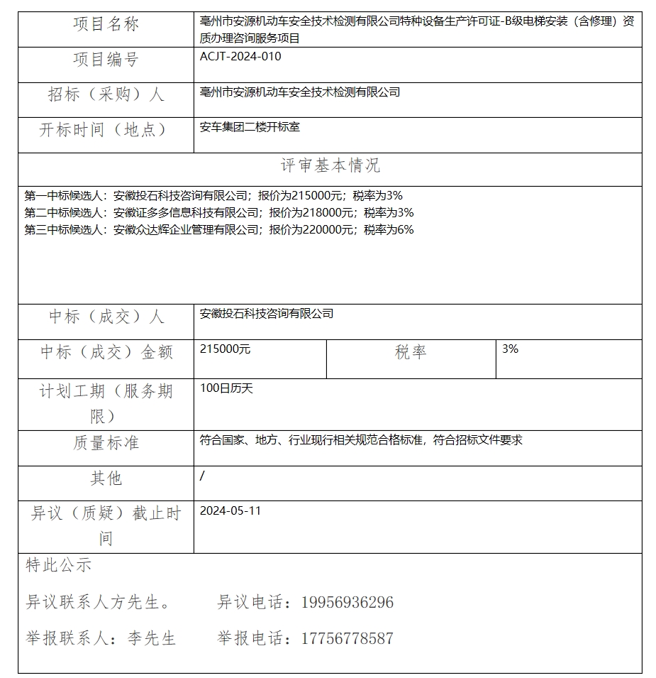 亳州市安源機(jī)動(dòng)車(chē)安全技術(shù)檢測(cè)有限公司特種設(shè)備生產(chǎn)許可證-B級(jí)電梯安裝(含修理)資質(zhì)辦理咨詢服務(wù)項(xiàng)目中標(biāo)(成交)結(jié)果公示