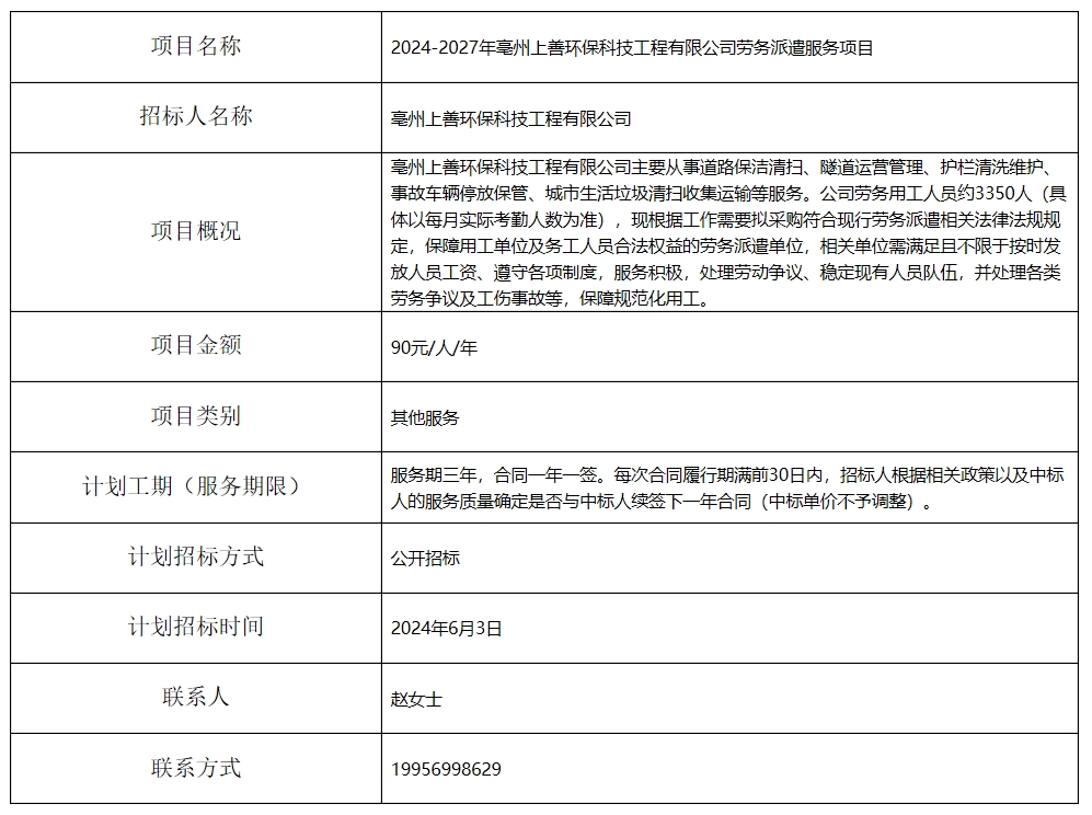 2024-2027年亳州上善環(huán)保科技工程有限公司勞務(wù)派遣服務(wù)項(xiàng)目招標(biāo)計(jì)劃