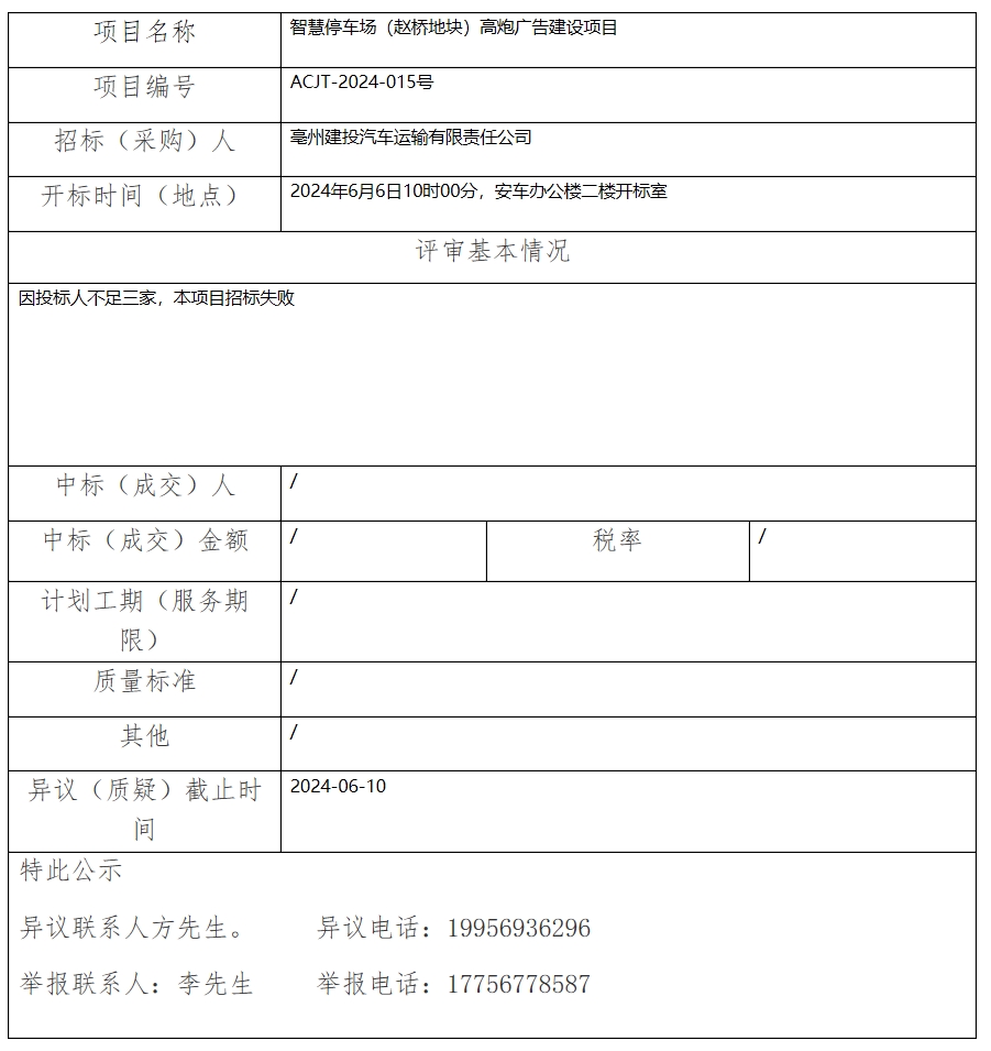 智慧停車場(chǎng)(趙橋地塊)高炮廣告建設(shè)項(xiàng)目中標(biāo)(成交)結(jié)果公示