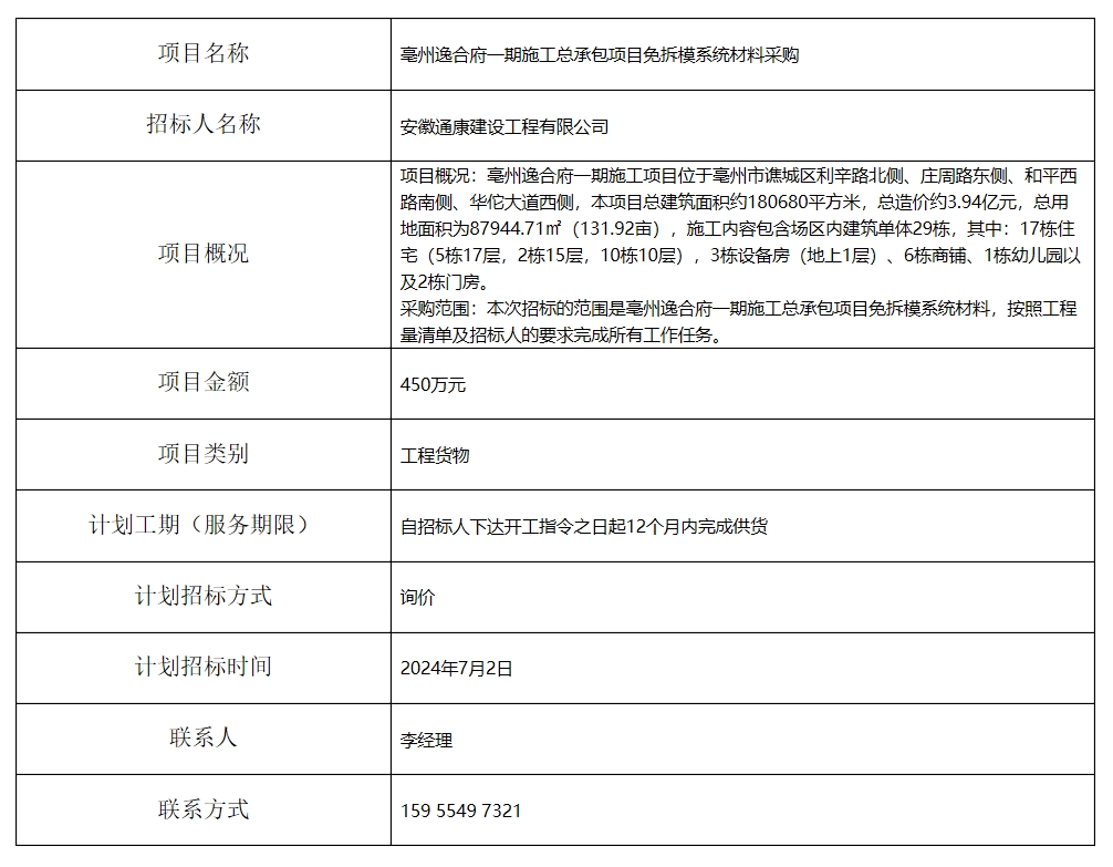 亳州逸合府一期施工總承包項目免拆模系統(tǒng)材料采購招標(biāo)計劃