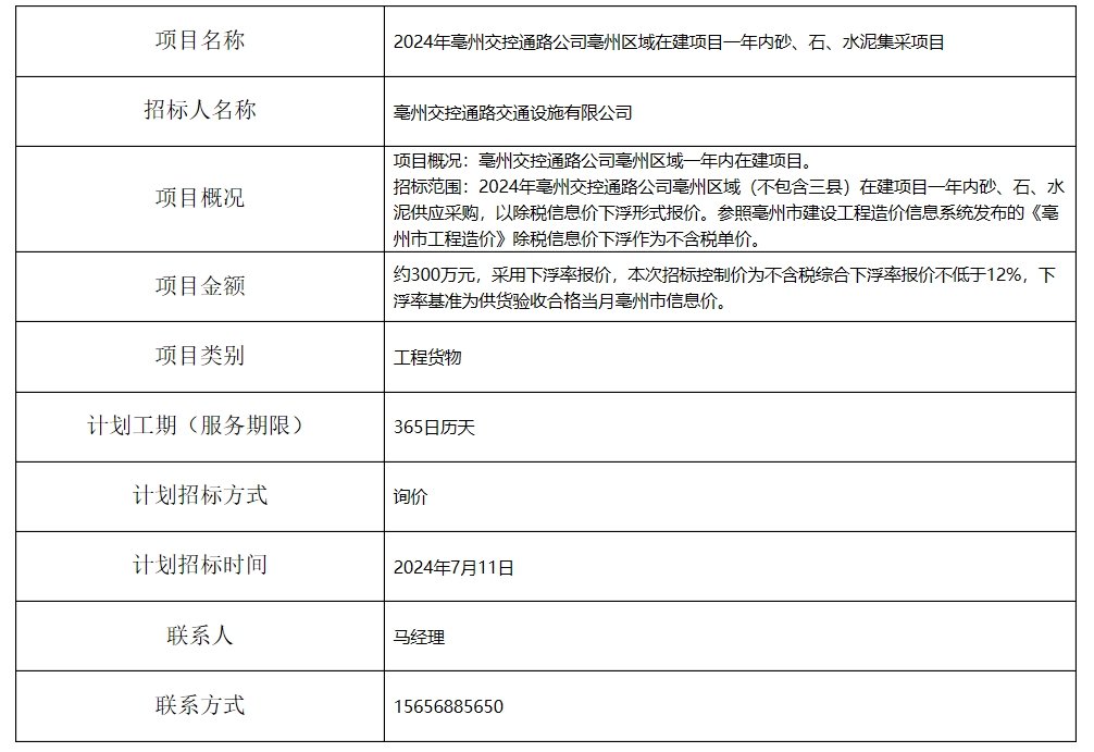 2024年亳州交控通路公司亳州區(qū)域在建項目一年內(nèi)砂、石、水泥集采項目招標計劃