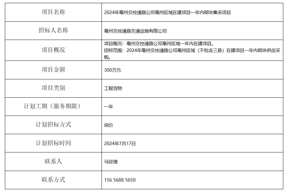2024年亳州交控通路公司亳州區(qū)域在建項目一年內(nèi)砌塊集采項目招標計劃